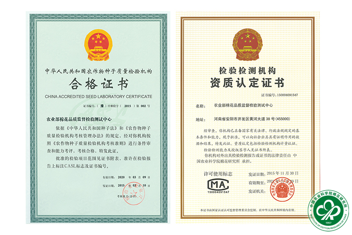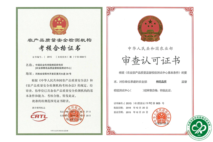 本中心于1990年首次通过国家计量认证和农业部机构审查认可,1991年正式获得批准与授权。其后又6次顺利通过国家资质认定、农业部机构考核和审查认可复评审。是我国农业行业部级棉花种子、纤维和纱线品质的专业质检机构。