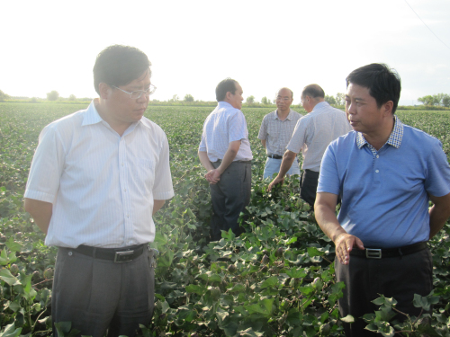 2013年8月26日,所长、党委书记李付广研究员一行考察新疆生产建设兵团第七师,加强了双方在棉花科技、成果转化和产业化等方面的深入合作。(右一 王光强、左一 李付广)