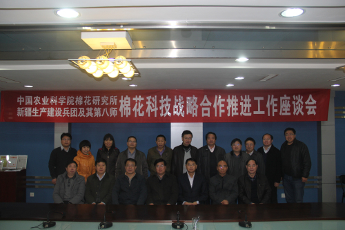 013年11月26~27日,新疆生产建设兵团第八师副师长张盈带队考察我所,双方就我所与八师及其农科院的棉花科技战略合作事项进行了进一步的交流与沟通,达成了共识,并就合作协议的签订事宜进行了商定。(前排:右起 王坤波 侯志勇 张盈 李付广 侯立宏 姜振东 刘金海)