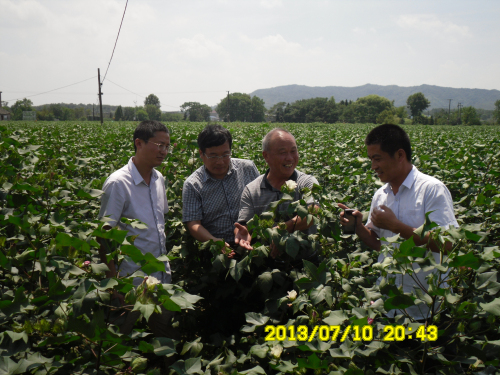 2013年7月10日,成果转化处李根源研究员(左二)在江西九江县考察中棉所76高产示范田