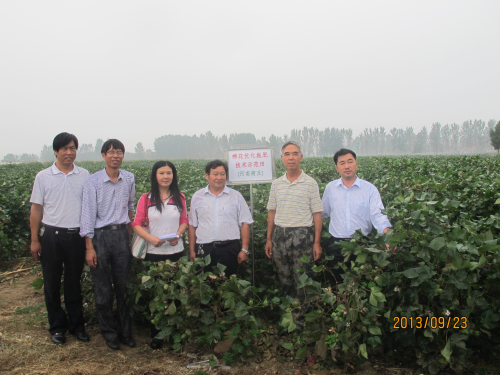 2013年9月23日,栽培研究室董合林副研究员(左二)和遗传育种室郭香墨研究员(右二)在河南商丘考察中棉所棉花优化施肥技术示范田