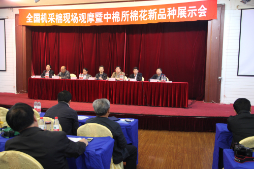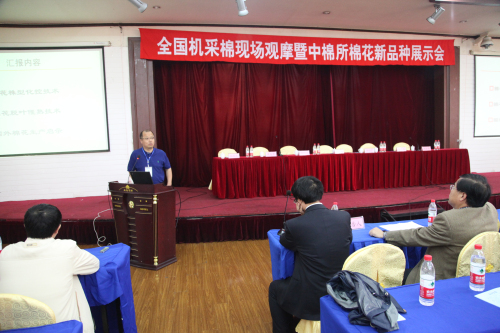 2013年10月19日,我所在河南安阳成功举办了“全国机采棉现场观摩暨中棉所棉花新品种展示会”,来自全国16个省(市、区)、新疆兵团117家单位210位代表参加了会议,中央、地方共6家新闻媒体对会议进行了现场报道。期间,代表们现场观摩了棉花的机械采摘、清花、轧花、打包等一系列流程,观摩了我所近几年培育的“中棉所”系列棉花新品种(新组合)及机采棉新品系,听取了相关专家所做的关于机采棉关键栽培技术、黄河流域棉区机采棉技术的开展、我国棉花轻简化机械化栽培的新进展新曙光、我国棉花生产的科技需求和机采棉培育探索等专题报告。