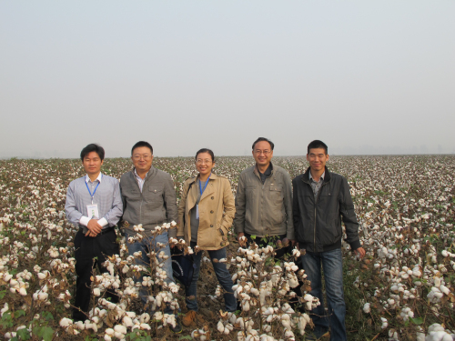 2013年10月19日,生物技术研究室主任袁有禄研究员(左二)与湖南隆平高科棉油种业孙卫平总经理(左一)考察中棉所60原种田