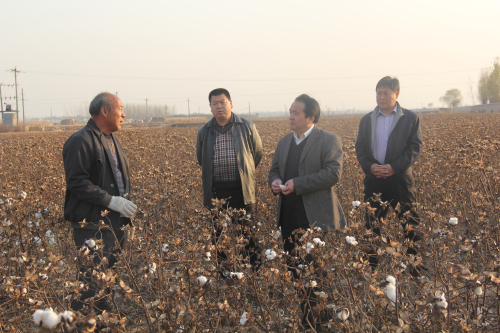 2013年11月19日,成果转化处处长张西岭研究员(右二)考察河北成安县棉花生产及中棉所60高产示范田