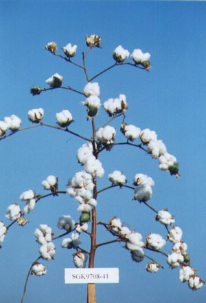 高效广适双价转基因抗虫棉中棉所41是我所育成的第一个国审双价转基因抗虫棉品种,将我国自主知识产权的Bt+CpTI双价基因,采用花粉管通道法转入常规棉品种中育成,高产广适,产量比同类品种增产11.2%-14.1%,比美棉33B增产22%-25%,2002年审定以来一直是黄河流域主推品种,占陕西、山西种植面积的50%以上;抗逆性强,抗棉铃虫性强而持久,减少棉铃虫防治70%-80%,棉花生长中后期抗虫性显著优于单价抗虫棉,抗枯萎病,耐黄萎病,耐干旱、盐碱;纤维品质优良,上半部平均长度29.7毫米,比强度30.6cN/特克斯,麦克隆值4.6;种植面积大,效益显著,2002年审定以来累计种植3691.1万亩,累计增收节支65.48亿元,新增社会经济效益45.26亿元。该品种先后获得陕西省科技进步一等奖和农业部神农中华农业科技二等奖,2009年荣获国家科技进步二等奖,专家认为,“该品种的育成是我国转基因抗虫棉育种的重大突破”。